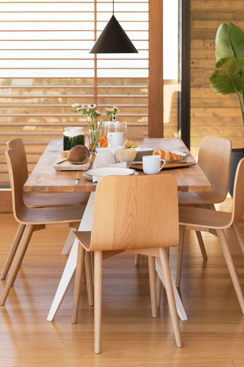 Modern and effortless. The Tami dining chair has a bent wood seat and rounded solid wood legs. Curved to the shape of the body, the edge of the seat is softened for added comfort. With a subtle radius on all edges, and durable lacquer finish, the Tami chair is designed for a busy dining or kitchen table.