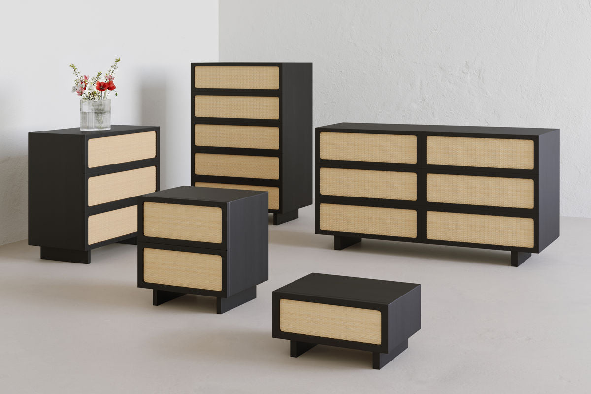 Stadium offers a larger storage option without sacrificing square footage, allowing you to hold more of your cherished adornments. Drawers are framed with solid wood and showcase the beauty of natural cane with a bold but classic design.