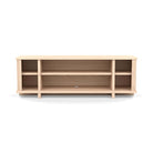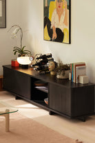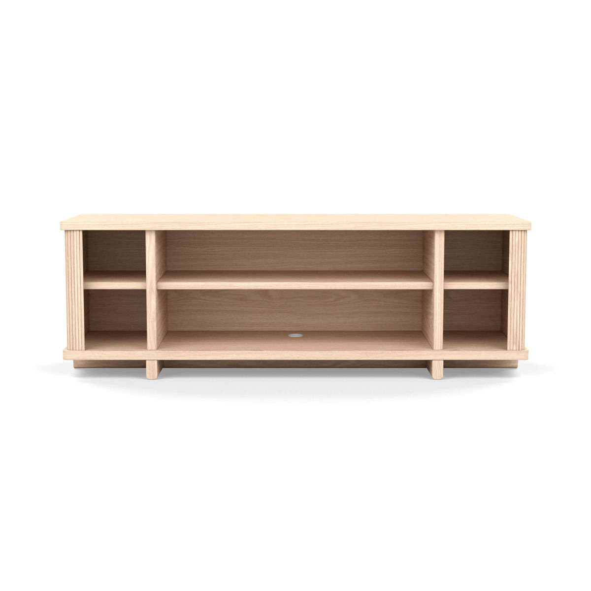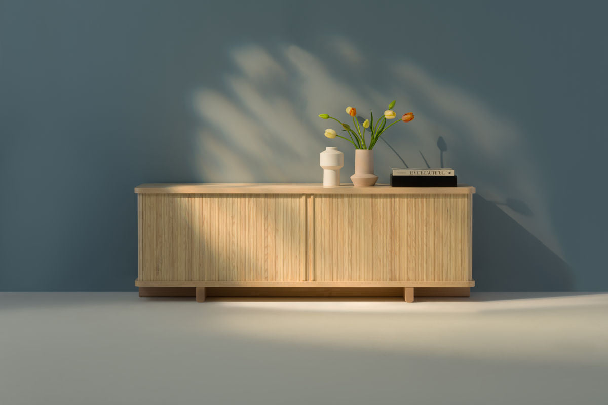 The Tambour collection is reminiscent of traditional roll-top desks made popular in the 19th century. Consisting of individual solid ash slats that are linked together with a hidden membrane, the pieces roll along a track, evoking memories of this traditional function yet re-imagined in a modern form. Adjustable shelves and sliding doors make it easy to access and use any electrical components.