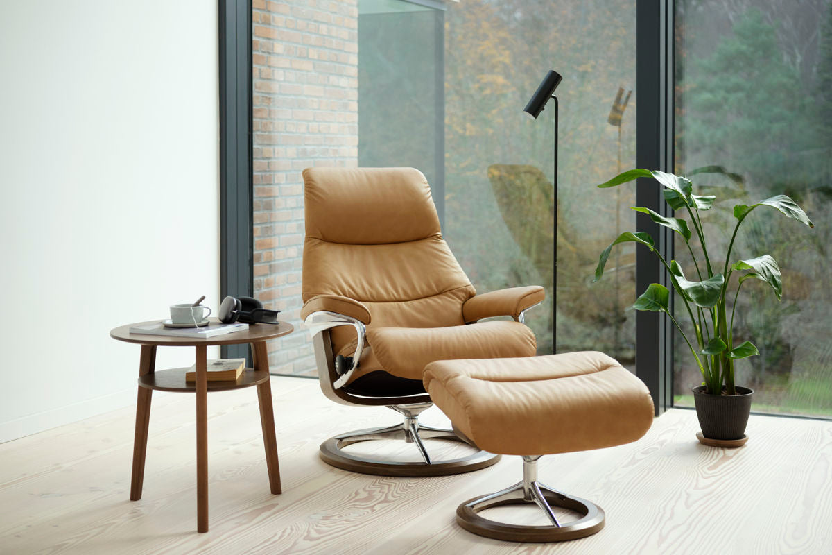 Soft and timeless. The Stressless View has ample cushioning, while retaining a timeless and modern cushion design with sleek contours. Fitted with a longer and slimmer back this recliner is great for those of us who need some extra length in the back. It also has an elegant and comfortable neck support which can be adapted to users of a variety of heights.