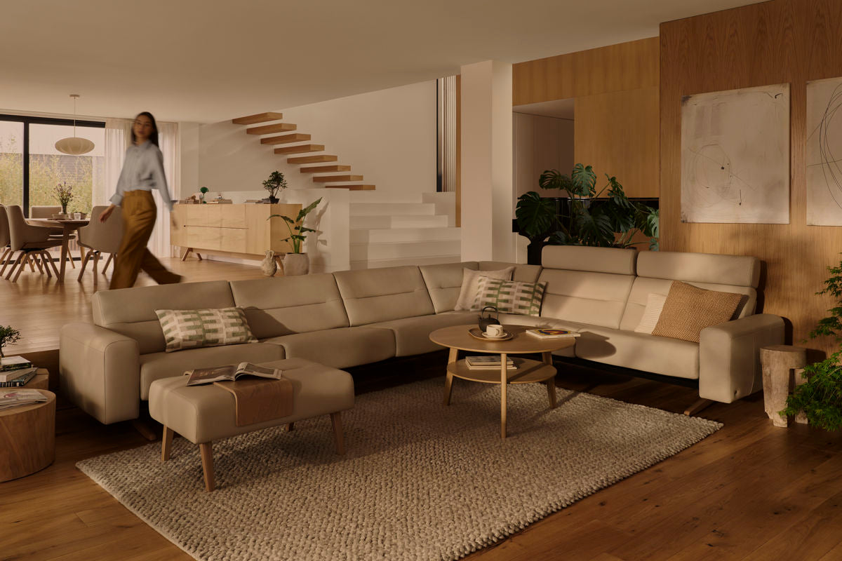Stressless Stella is a soft and contemporary modular sofa that responds to your movements. The Stressless BalanceAdapt™ system allows the sofa to respond to your natural movements by adjusting the seat as you move. Recline, lean forward, lie down or put your feet up and feel how the soft and generous seat adapts to your position. When the occasion calls for just a regular sofa, simply lock the function to stop the seat from moving. Available with different armrests and seat widths, an optional corner and custom headrest and footstool.